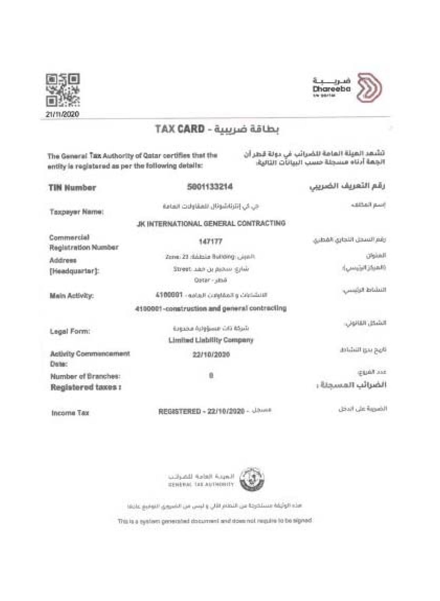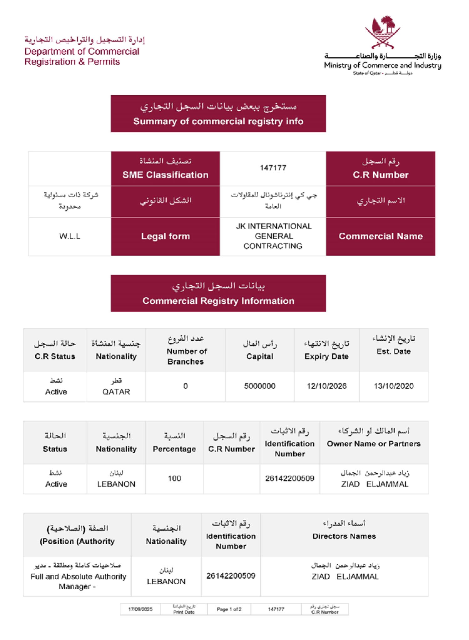 JK International is a Qatari based international construction company. Our impressive construction footprint in Qatar is led by our ever-growing pool of trained professionals. With over 250 work force, 45 plants and machines and over 2 million complied total build up area of diverse projects in the sectors of infrastructure and heavy construction building and oil & gas.
